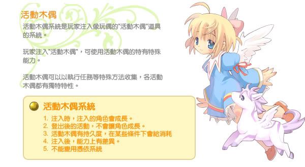 活動木偶系統就是玩家可使用「活動木偶」道具,變身成酷似可愛玩偶的木偶;玩家變身成木偶可以使用活動木偶的特殊能力;玩家可以藉由完成特殊任務的方式來獲得活動木偶的話,而每種活動木偶也都有自己的獨特特性。