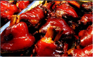 沿途打着“万三猪蹄膀”招牌的商店鳞次栉比,有序的排列着。每个商家门前这时,都有小推车堆着装满诱人垂涎的油亮欲滴埕亮埕亮满铁桶的猪肘子,正准备排列上架。