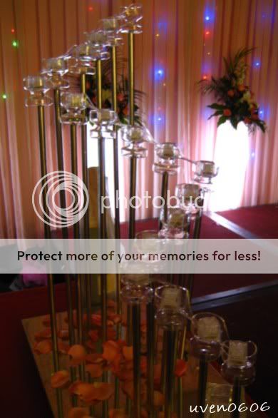 晚宴就差不多到9点吧。在晚宴里,我又发现了另一个不一样的,就是敬酒。哇,他们是去每一桌一个个的敬酒,男的就给他点根烟,女的就敬酒。(呵呵,我们这里只是一桌一桌的人一起敬,只是敬酒没点烟。)很热闹的婚宴!! 这是倒香槟酒的,当香槟流下的时候,酒会一杯杯的亮灯了。