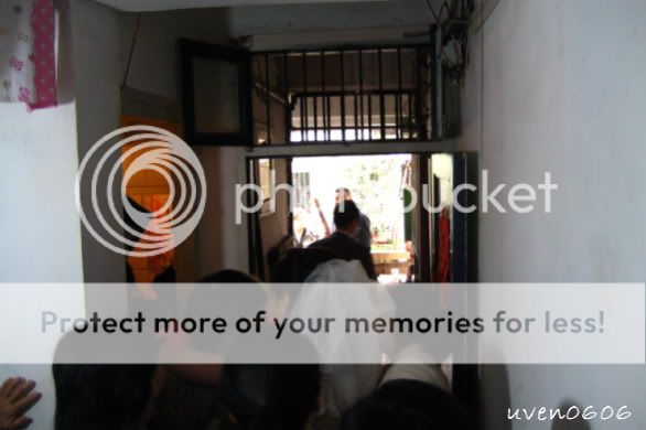 过了不久,听到外面鞭炮声响,新郎官到了。哎哟,我竟然忘了走出去看看。怕羞的我只在房里和新娘子在一起。我应该到房外看看她们是怎么玩新郎官的。既然没出去,就在房里拍拍那些姐妹的气氛吧。隔着门聊天,要用喊的,哈哈,因为外面人多,太吵了。玩了一下,就让新郎官进来了。(我觉得他们那边比较有人情味,哈哈,换是我们这里,新郎官和那些兄弟已经被玩残了。)