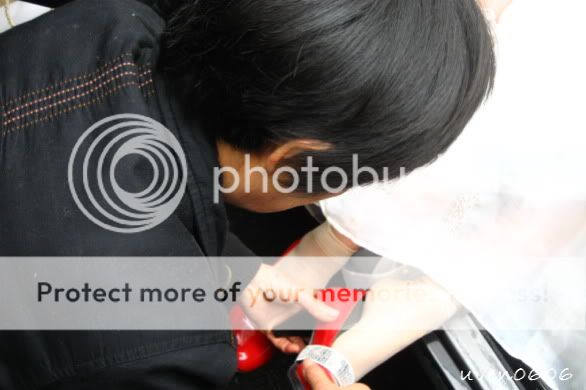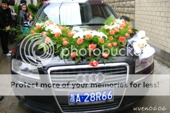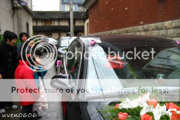 接了新娘子,吃了汤圆,就是向长辈敬茶的时候啦。非常简单的敬茶仪式,只敬给奶奶和爸爸。(在我这里要敬好多人啊!!)然后就是出门啦,但为什么是姑丈抱她到车上后,姑妈帮忙穿鞋呢?(出门不能穿鞋子)嘿嘿,我都没问为什么。可能是不一样的习俗吧。(在我这里就是老爸开红伞把女儿送上车。)过后我就随便上一辆车跟去新郎官的家啦。他们是租车的(包括司机),不像我们都开自己的车。新郎官的家在农村。