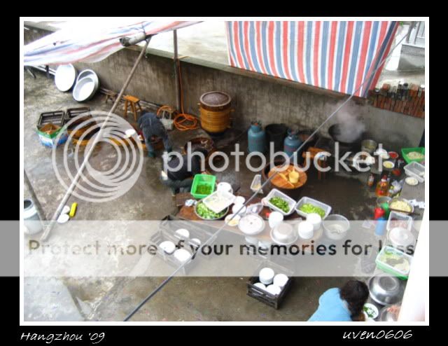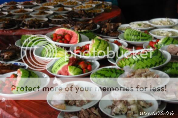走进新郎官家的门口,就看到外面有临时厨房,现煮现吃。桌上也摆着美味的菜肴和西瓜。简单的仪式过后,就是享用午餐的时候啦。哇,看到桌子上都摆满了很多很多的美味菜肴。我第一次看到那么多菜肴在餐桌上,坐下来的时候还不断有菜端上来。哇,我的天啊!!(嘿嘿,我才发现他们的胃口蛮大的。)
