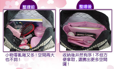 ●非常粉嫩可爱的一款整理包,里部有多个隔层, 还配有拉链袋, 手机、皮夹、MP3、化妆品等随身物品都能整整齐齐地统一收集起来, 包包变得更干净, 也节约了翻找物品的时间