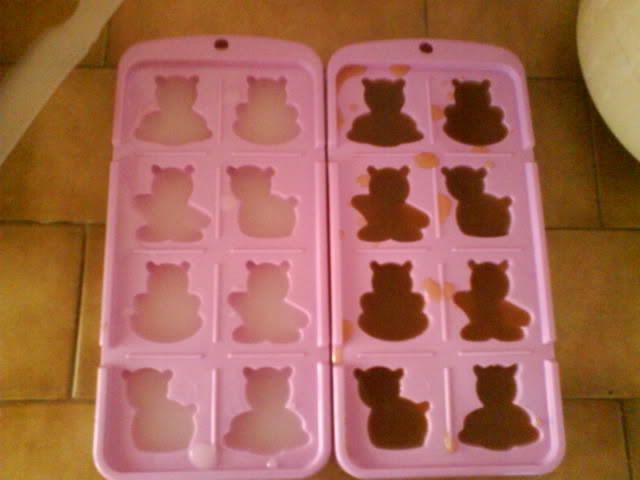 3. 可以开始倒入mould了咯,将agar agar倒入碗先,然后加一点色素,然后就倒入mould里。我是用碗来测量agar-agar的厚度。
