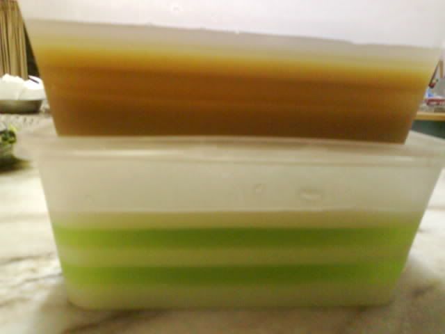 5. 第二层我有放椰浆,同样的做法,将agar agar倒入碗先,然后加两汤匙的椰浆,再慢慢倒入mould里。