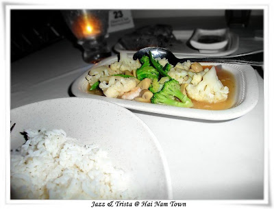 头盘只有两种选择,我和小晶当然一人选择一种噜。这道是Fresh Garden Green Salad,材料有新鲜包菜、小番茄、红黄青灯笼椒、黑橄榄还有一粒粒类似绿豆可是很酸的豆豆然后淋上千岛沙律酱。基本上味道除了酸还是酸,可是尝多两边还会发觉有点甜甜咸咸的味道微微混杂在里面。另一种头盘选择就是Cream of Mushroom Soup。当汤匙插入汤内那一刻,你完全可以感觉这蘑菇汤是多么浓郁的。而且由于我跑到一边去拍照,小晶嗅到蘑菇汤的味道,已经想不等我拍照就直接开动了咧。浓郁的蘑菇汤,里边好像还掺杂了马铃薯一起熬,因为我觉得有马铃薯的味道。(还是我想马铃薯想傻了 )