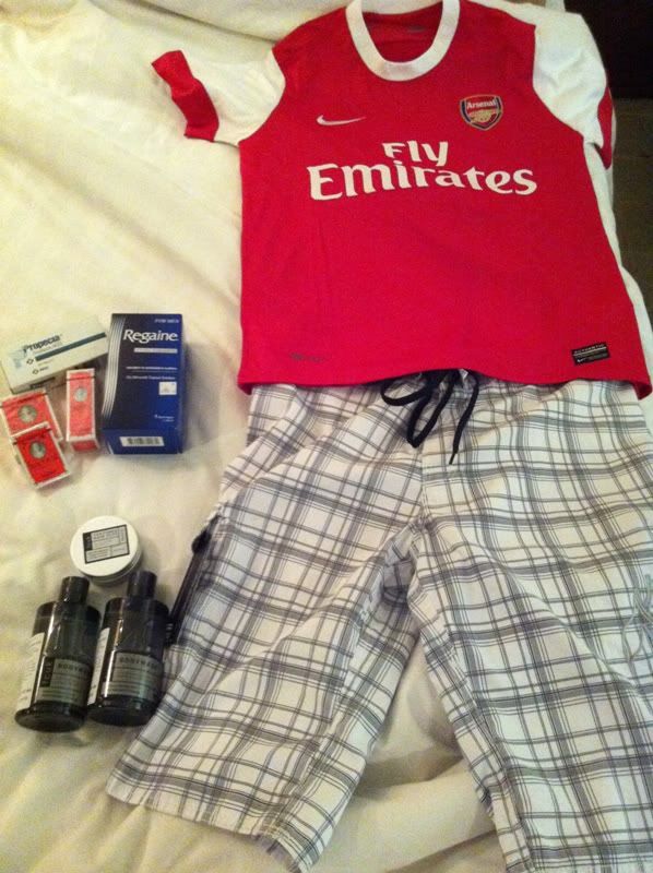 喝完后回房拍今天的战利品… 买了枪手的球衣(600baht),短裤(300Baht),FCUK 的body wash(一瓶大概195Baht) + hair wax(也是195Baht), 风油, 一些药..