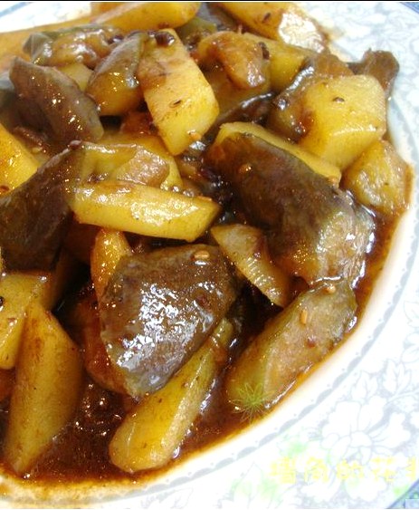 炒锅内加油,烧热后下葱花爆锅,然后下肉翻炒几下,放点盐和酱油适量;将土豆和茄子同时下锅,翻炒;在炒的过程中加盐、鸡精、味精、少量的醋;翻炒到基本上茄子都过了油、土豆颜色加深后,向锅内加清水,水量控制到菜的四分之三位置;盖上锅盖炖一会,出锅前20秒左右加准备好的大蒜、香菜或者香油。 |