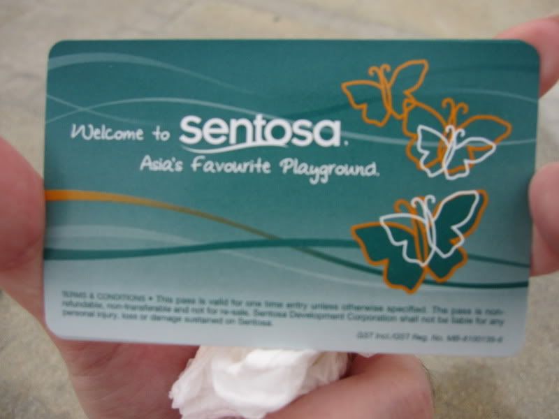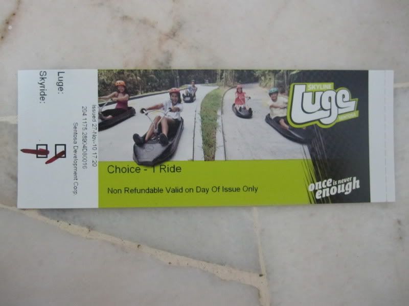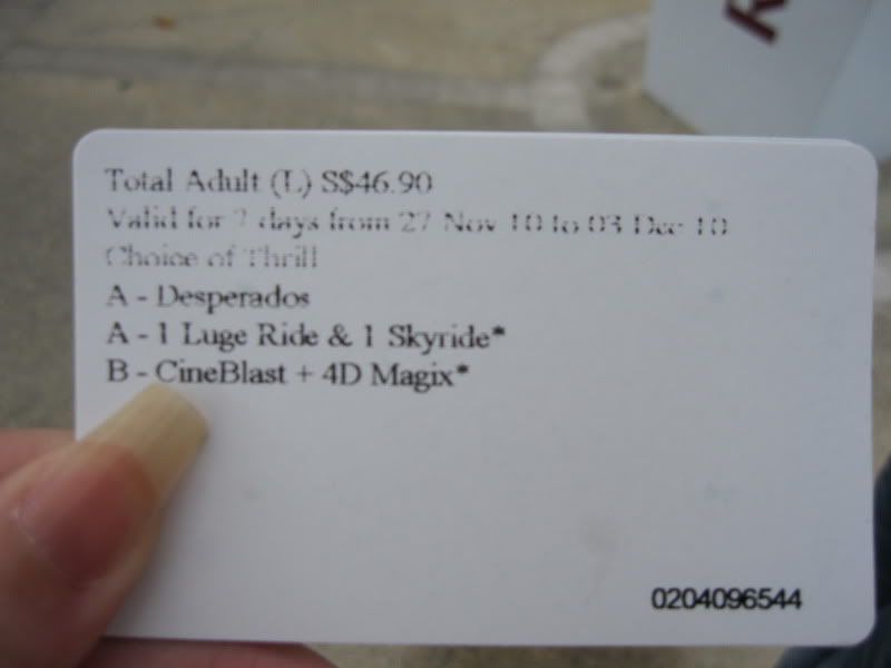 从Aljunied去要到Outram Park转去Harbour Front站。进到Vivo City到三楼Lobby L 就可以去那边搭Sentosa Express . 不过在还没进Sentosa Express,在右手边就有个很大的柜台卖Sentosa的票,不过他们有告示当天Universal Studio的票已售完,很多人排队。小婕就直接搭Sentosa Express到Waterfront Station.那边有好多售票柜台,买了28.11.2010的票。一张大人的票是$72,送一张用餐折价卷和一张$5精品折价卷。过后再看看当天可以玩些什么。Sentosa choice packages 有两个配套,Choice of Fun 和 Choice of Thrill.