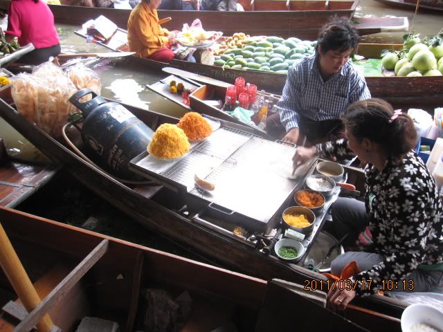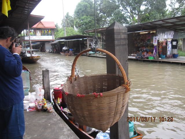 第二天,原本要去Grand palace的,因为第一天在考山路mama tour买了floating market 的票,就先去了floating market.一个人300bath,坐了好久的车程,大约一小时半,才到达那儿的住宅区。 从住宅区坐着木船,慢慢的到达水上市场,天气很冷,下着毛毛雨,我顶着雨伞,坐在船里,看着两旁的屋子,没什么人。我在水上买了饰品,虽然,杀了价,最后还是发觉chatuchak便宜,可我享受在水上买东东的情形~《再续》