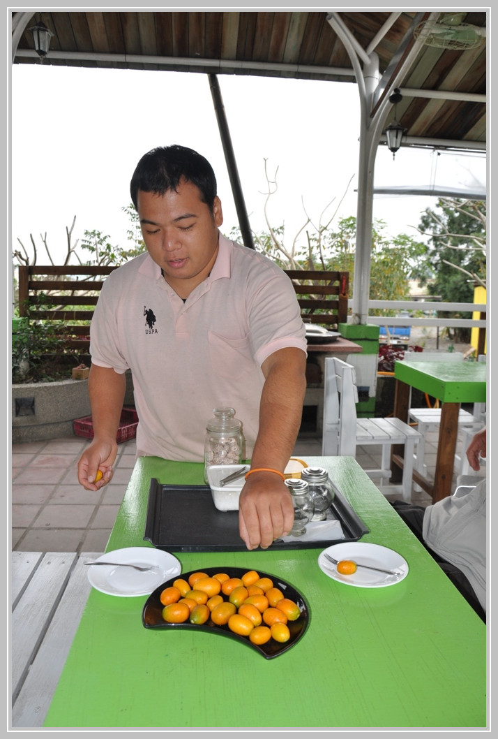 一到农场就有讲解员欢迎我们,首先,他让我们自制金枣蜜饯.我们在台湾的这段时间刚好是金枣盛产的季节,所以到处都可以看到结满金枣的果树.