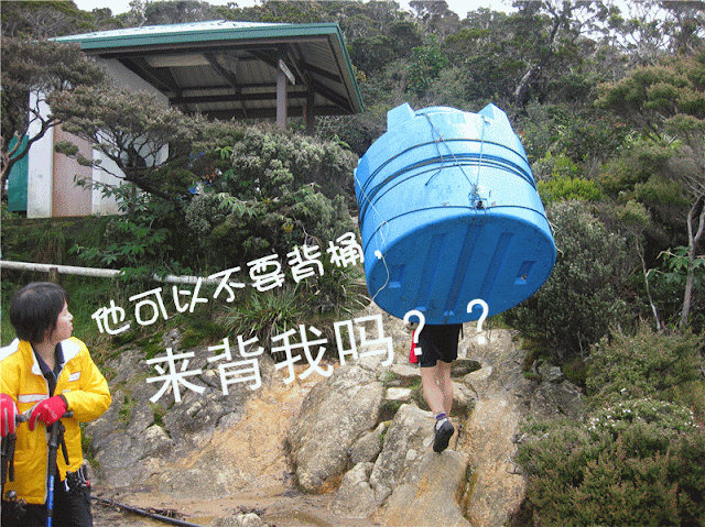这时,我真的渴疯了。没办法,只好抬头张大嘴喝雨水。哗!冰凉直达心里。一低下头,好想哭哦!怎么搞到这么凄凉?上次我来时艳阳高照,晒到我差点儿脱皮叻!压根儿没想过下雨时爬山,会是这等情景。转念一想,就我个人而言,2次的登山,天气与路线迥异,真的是非一般的体验啦!但就可怜了他们3人。因为这次,我是想为他们安排美美的旅程,却连下了2天雨。真是“歹势”啦!这就是我在之前《策划篇》说的——人算不如天算咯!