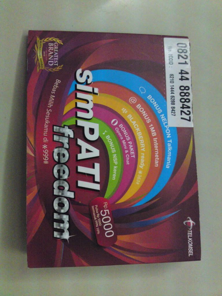 一張同情卡要價 RP22﹐000 (買電話卡﹐要給TAX 的。。真是的!) ﹐裡面只有RP5﹐000 的通話費。如果要查詢剩餘多少錢﹐可以按 *888#﹐ 但必須要先打一通電話作為 Active Card 才能查詢。本人就是一直按﹐一直按都無法接通電臺。。 |