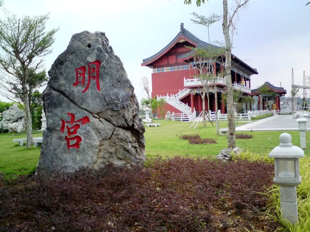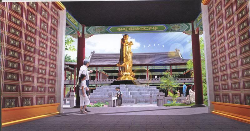 阿弥陀佛为西方极乐净土世界的教主,凡持阿弥陀佛名号者,生前活佛护佑,消除一些灾祸业苦;死后更可化生其极乐净土,得像一切安乐。树立与明宫正方的阿弥陀佛金身神像,高约25尺,颇有威望肃然之感。阿弥陀佛左手持金莲花,平胸而立,右手下垂,做接营众生状,为接迎佛,象征慈悲;中有一莲台,表示接迎众生的意思。阿弥陀佛莲座台下的水流,映射出缤纷耀眼的采光,律动的淅淅流水声,带走访者心中的烦忧与劳顿。阿弥陀佛加持十方信众获得喜乐,令访者都能欢亲近,阿弥陀佛眼神则表现出禅定与关爱,令访者心中自然泛起祥和与宁静