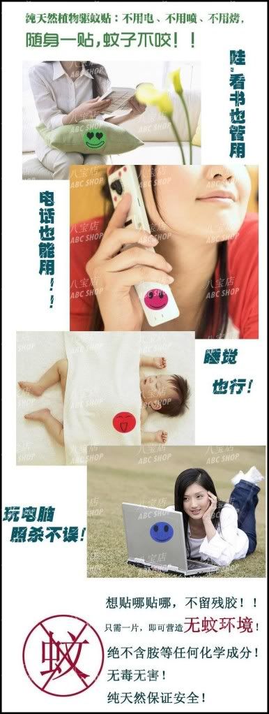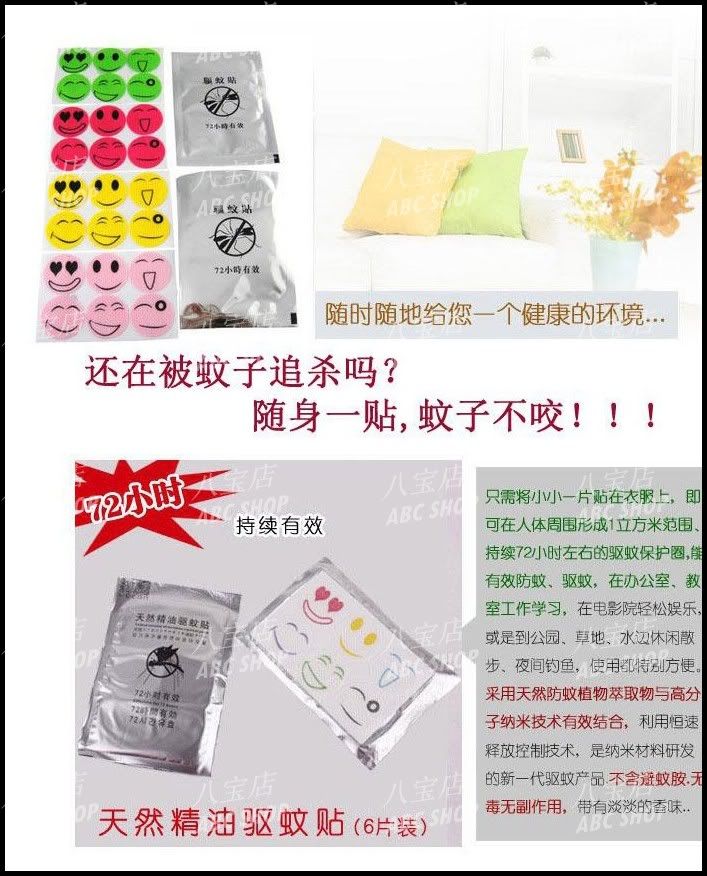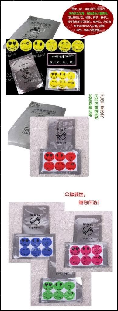 卡通笑脸驱蚊贴我们全家都用的很好, 用了它后不再被蚊子叮哦。还有他可以耐多过3天哦。我用了一个星期都没有被蚊子叮哦 |