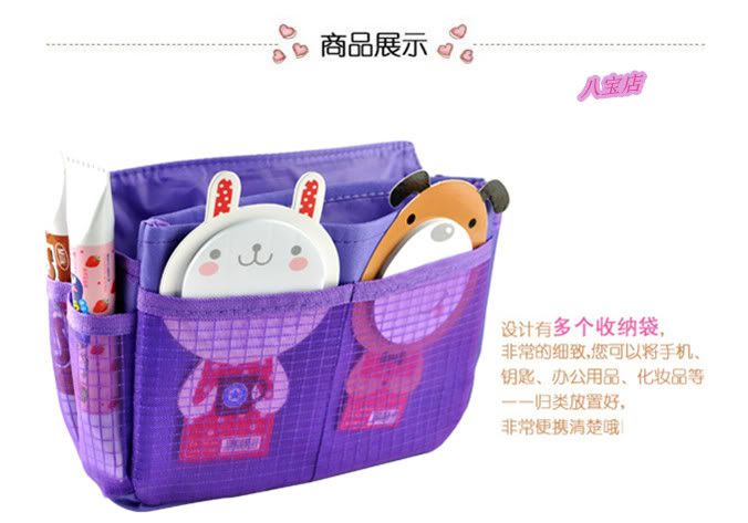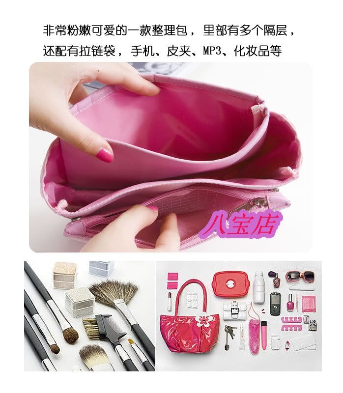 非常粉嫩可爱的一款整理包, 里部有多个隔层, 还配有拉链袋, 手机、皮夹、MP3、化妆品等随身物品都能整整齐齐地统一收集起来, 包包变得更干净, 也节约了翻找物品的时间。