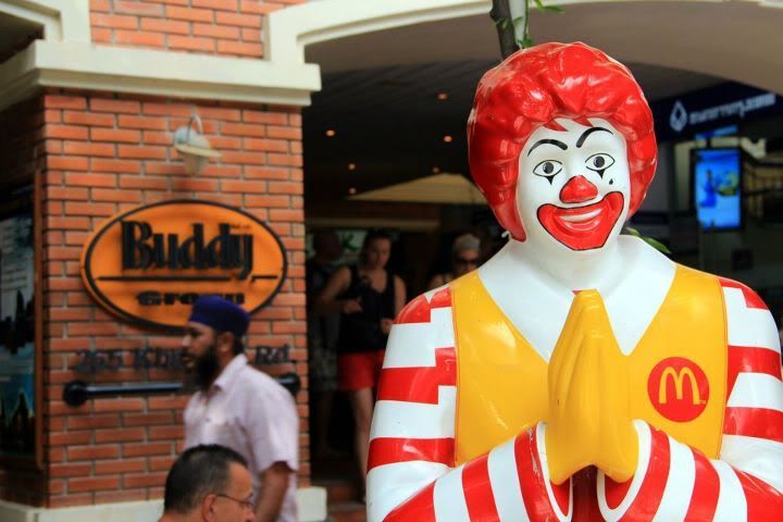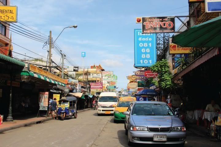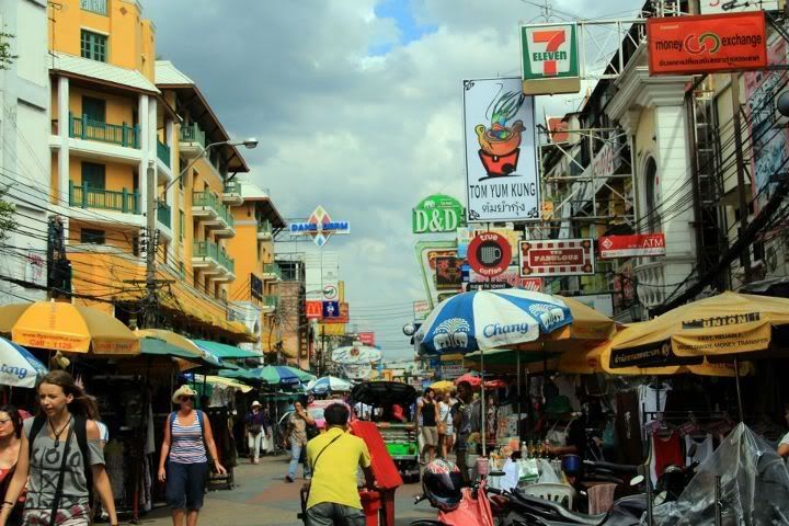吃饱后就继续在附近逛逛。走了那么远,没力再走回khaosan road了。Tuk tuk比德士容易找,就决定坐tuk tuk回khaosanroad。70泰币。其实坐走meter的德士应该比这便宜。途中看到网上介绍的grasshopper,看到一些游客要开始他们的脚踏车夜游。会有人带着游客骑着脚踏车穿大街小巷。之前有把这活动安排在行程,由于价钱不便宜就取消了。 Tuk tuk司机停在khaosan road burger king 附近。走走看看,顺便买一些小吃回房间。晚上的khaosanroad很热闹。很多东西看,很多东西买,很多东西吃。价钱会贵一些,要杀价。要喝酒或咖啡都有。这里guesthouse选择不少,比较热门的都爆满,还是先预订比较好。这里到处可以找到7-11,非常方便。Lamphuhouse出来左右边都有7-11,我们就进去买了一张sim card和饮料。Massage服务也很多,路边的都爆满,全都是西洋佬。(如果逗留多天,买大瓶的矿泉水比较划算,然后再倒进小瓶)