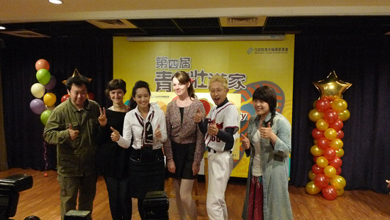 青辅会6日在台北举行国际青年壮游家分享会,5名国际青年分享他们在台湾旅游的经验,青辅会主委陈以真(左3)鼓励青年朋友背起行囊“壮游台湾”。(中央社记者张皓安摄 101年4月6日)