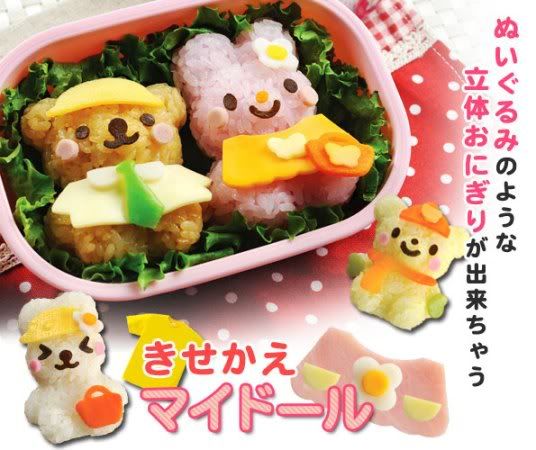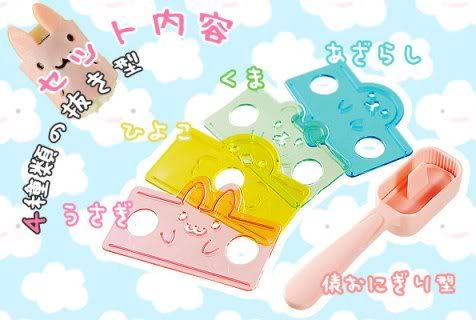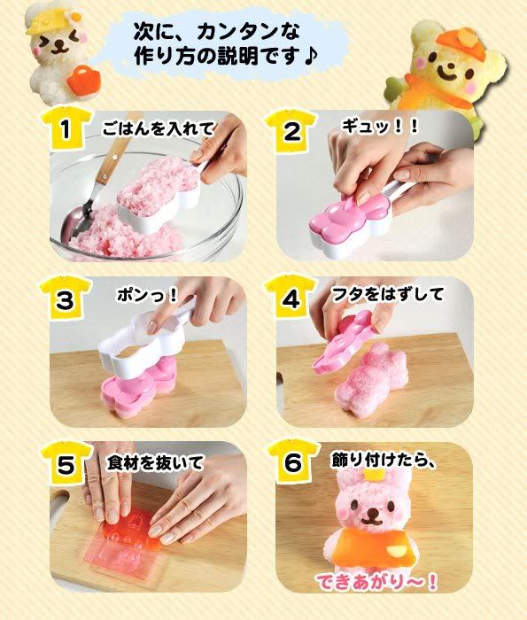 成品小熊约70克左右;成品小兔子约80克左右四个压板可组合16组装扮小熊饭团:白色的饭勺,浅棕色的饭团盖小兔饭团:白色的饭勺,粉红色的饭团盖材质:饭团勺:ABS树脂饭团盖:聚丙烯