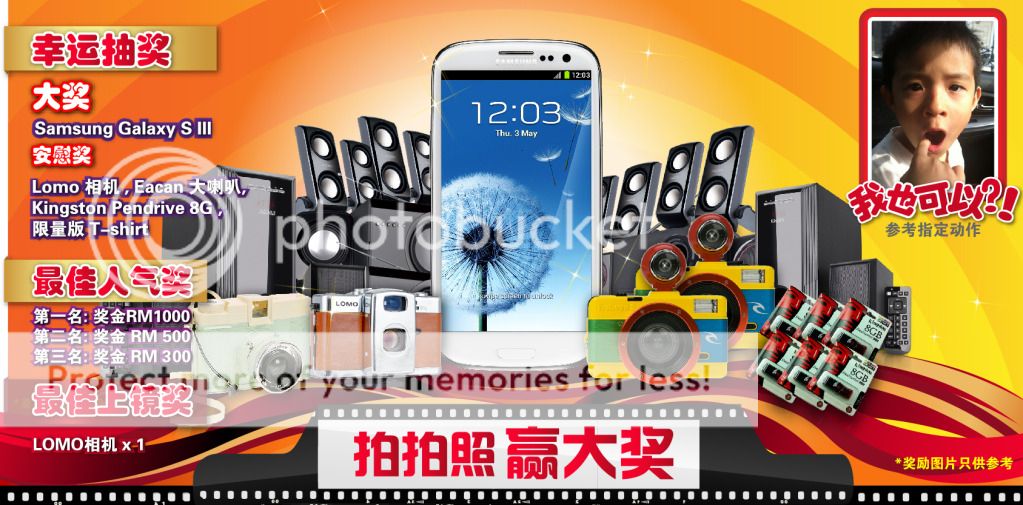由Redapple.asia运营的《神龍Online》所主办的“我也可以?”拍拍照,赢大奖就是这么一个好康头!参赛步骤非常简单, 一张照片就可以赢取最新的Samsung Galaxy S3! 除此之外, 还有机会赢取现金奖 RM1000.00. 当然奖品不止这些, 其他还有Eacan 大喇叭, LOMO 照相机等等!!!