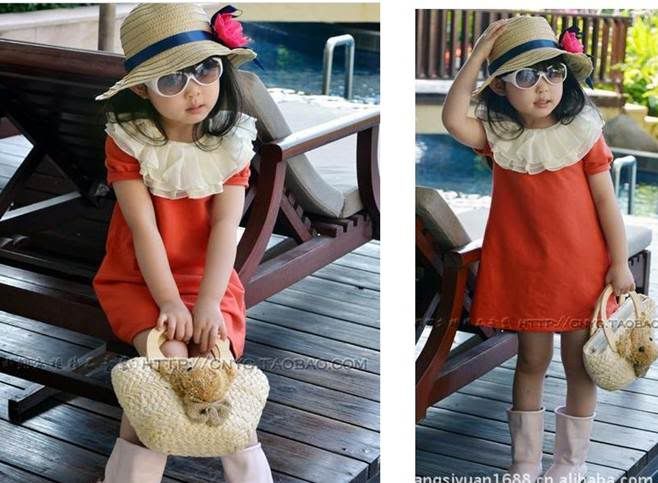 G011 - 台湾品牌白荷叶边领气质连衣裙*桔红色