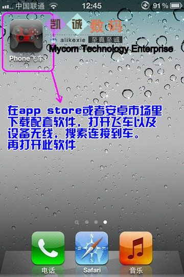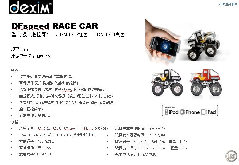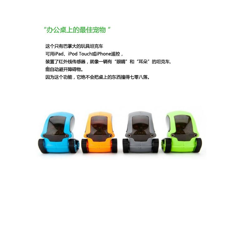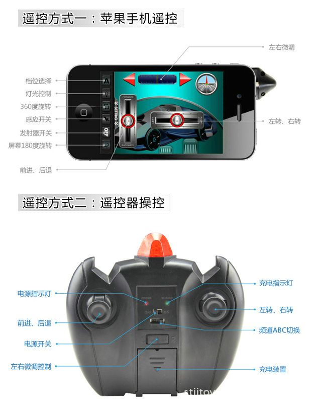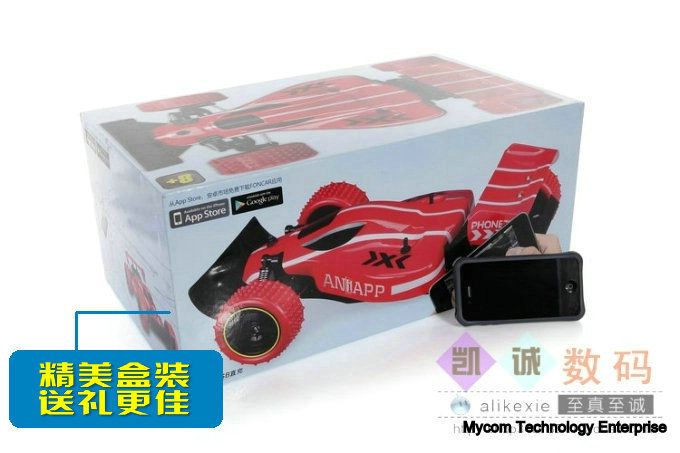 phone 飞车 wifi 遥控玩具车 产品特点: ★将苹果设备以及安卓设备变成玩具汽车遥控器 ★操作模式:三种:陀螺仪传感、触控操作、重力感应控制