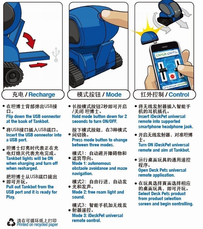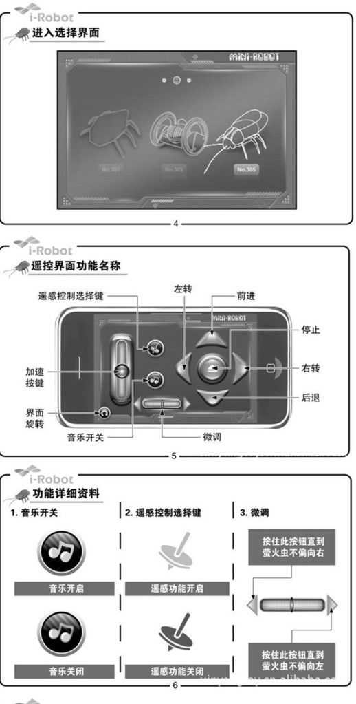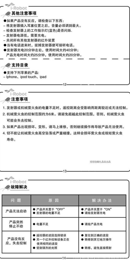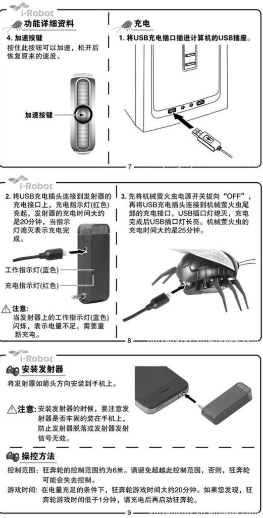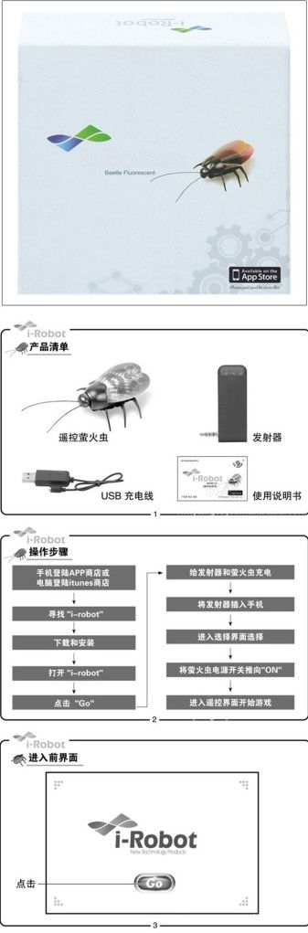 1. iphone、iPad、iPod Touch 到App Store搜索下载安装应用程序i-Robot 操作步骤: - 将甲虫连接充电线充电(本产品出厂时已经存有部分测试电量在内)