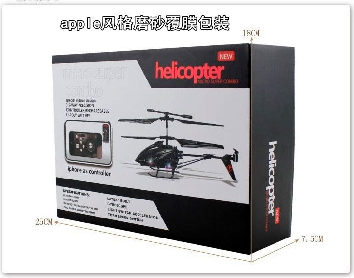 3通道带陀螺仪,前进、后退、左转、右转、上升、下降、空中旋停、左右甩尾(可利用 IPHONE 重力感应***进行方向控制) ****就是你的手机摇左,它就转左(好像wii)