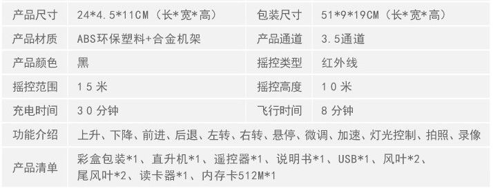 卖点五:赠送超全的配件,USB充电线,主风叶*2、尾翼*2卖点六:如有苹果或安卓手机,可选手机控制版本,重力感应****控制新奇的玩法,让身边的人羡慕不已