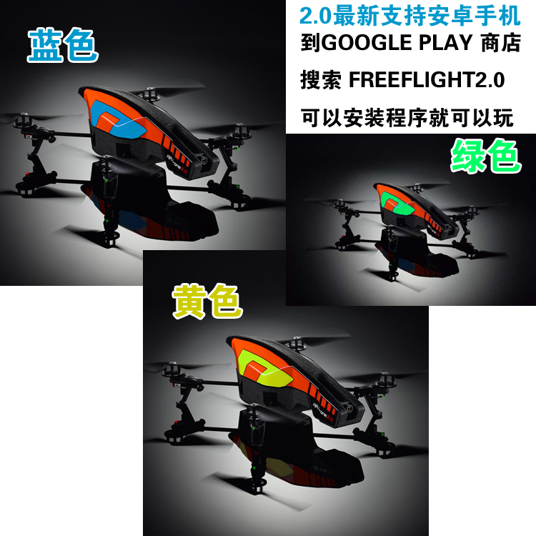 Parrot AR.Drone2.0基于四轴智能设计,拥有四个独立螺旋桨,外形时尚,炫酷! 初次目睹其风采,无不眼前一亮。 这款飞行器的下方还加装有重力感应装置、陀螺仪、机械控制芯片等部件,利用智能飞行技术可以纠正风力和其他环境误差。 Parrot AR.Drone2.0四轴飞行器内置ARM9 CPU, Linux操作系统, 通过WiFi来控制.开放的Linux内核使得在Parrot AR.Drone2.0增加新设备成为可行...用户可以使用iPhone手机、iPad、iPod Touch、Android手机或平板电脑等对其进行飞行控制操作。 在未来,它将扩展到在安卓等其它平台上使用。 Parrot AR.Drone2.0 内置了两台摄像机,一台在前面(1280*720像素),一台在下面(对着地面)。同时,视频画面会同步传送到手机或平板电脑上。使用应用程式中的按钮,便可以轻松切换这两台摄像机。 更为玩家们惊喜的是,两台以上Ar.Drone2.0可模拟空战游戏,使得Parrot AR.Drone2.0完全不等同于一般的航模遥控飞机,而玩家只需要到苹果App Store中下载相关软件即可(游戏对战暂时只适用于苹果用户,安卓用户的相关软件正在开发)。 模块化的设计,使得Parrot AR.Drone成为一个很好的DIY平台无论是售后维修,还是扩展Ar.Drone2.0的功能,添加了一个翻滚的动作,。 Parrot AR.Drone2.0在室内外均可使用。您可以根据游戏环境选用它提供的两个机壳。当 AR.Drone 2.与藏匿于室内的敌人作战时,全壳护罩可防止发生碰撞损坏。流线型机壳符合空气动力学原理,提供更强大的室外操控性能。