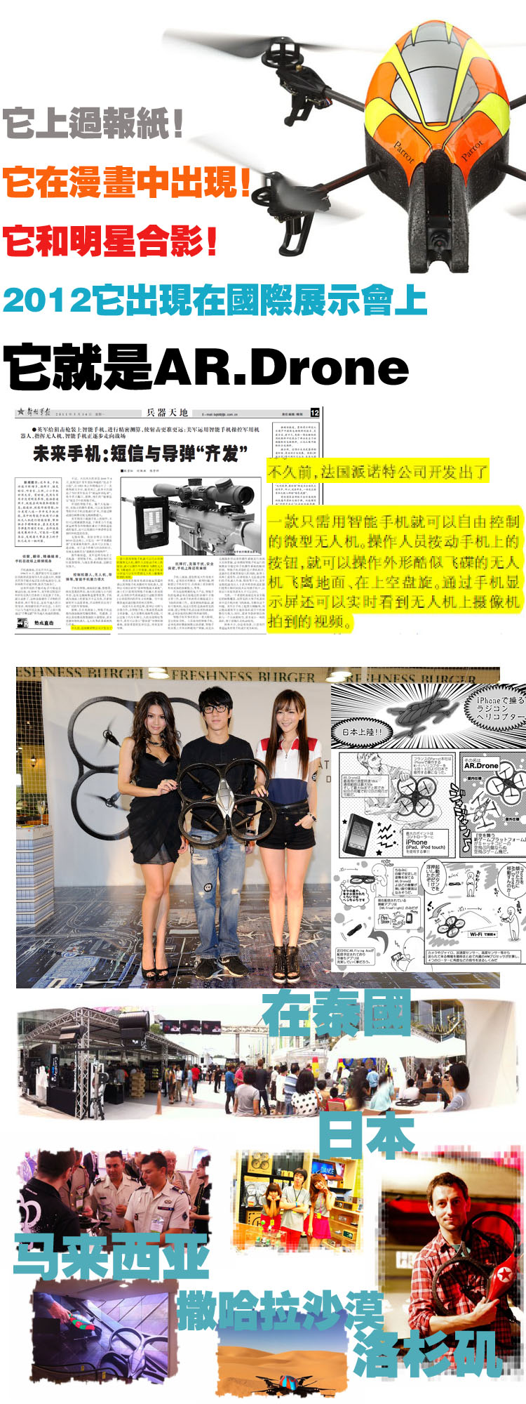 AR Drone 是一个利用 iPhone 控制的直升机,这款直升机厉害之处是其极度稳定,不会受气流影响,左摇右摆,即使需要在半空静止不动也没有问题,而且降落时极之平稳,实在很强。