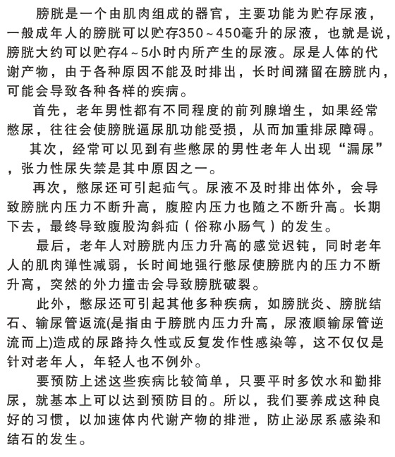 应急尿袋尺寸:25.5*13CM 收纳袋尺寸:23*45CM 外包装 4个入一包,包装尺寸:25*15CM 包装样式:OPP吊卡袋,内加四色印刷说明纸卡 重量:103G 【产品特点】: 1.袋内有超强吸收包,能立即吸收尿液并变 为胶状物质,避免尿液外溢,不产生异味。 ( 600CC ) 2.依照人体工学原理设计的尿液注口,适合 男女老少安心使用。3.方便携带、二层精致包装、健康卫生。 【用 途】: 1.长时间旅行、长途驾车,帮助您解决由于种 种原因无法方便的苦恼 ,更有利于身心健康。2. 帮助因受伤、疾病等引起的行动不便的人 群使用. 提 醒:使用后,将尿袋装入所附塑料袋,将袋口打结后丢弃。 【适合人士】:1、开车族(含乘客) 2、不包尿布的小孩 3、残障及行动不便者 4、女性外出露营及旅游必备 5、喝酒过量者 医学证明:过度憋尿,易得膀胱炎、肾脏病或相关泌尿疾病
