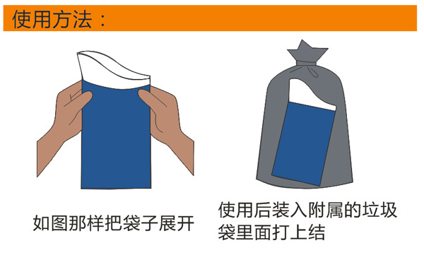 ■本产品是一种便捷式随身携带应急用微型马桶,包括柔性的袋体,袋体的外表采用环保型抗拉力不透水PE材料,PE材料内衬环保吸水性强的粗纹无妨布,表层+内衬有一定厚度且起到按压定型作用,袋体内部两侧及底部分别有两个夹层,一体型设计,夹棉内夹层中分别装有超强吸收固化剂。能迅速吸收尿液并变为胶状物质,避免尿液外溢, 不产生异味。 ■依照人体工程学原理设计,可灵活折叠尿液注口,全面解决男女通用,老少皆宜的难题。 ■包装同时配备一个一次性胶袋,方便用完后放置胶带内,第一时间密封起来,起到清洁的同时,防止尿液粪便等的传染。