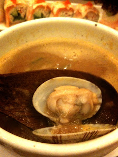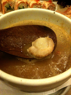 別急!!左翻右翻, 總於讓我翻出一只蝦子, 一顆蛤蜊, 以及一顆mini扇貝, 分量跟圖片真的是一模一樣!! 只不過縮水了1.5倍~ 湯喝起來有海鮮味, 淡淡的奶味, 以及讓人不易察覺的番茄味.