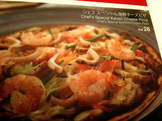 算了, 回到Pizza的部分. 這個海鮮Pizza有海鮮的部分有蝦子以及切絲的Sotong, 蔬菜的部分除了叫她不要放的青椒外, 還有大蔥, 紅蘿蔔, 還有一樣我不是很確定, 感覺是白蘿蔔的樣子. 底下鋪了一層Okonomi的醬料. 吃起來還不錯, 只不過, 這是我第一次吃到Pizza是餅皮跟餡料是完全分離的~意思是說, 你無法用手像吃一般Pizza一樣把它拿起來直接放進嘴裡, 因為餡料會直接滑下.