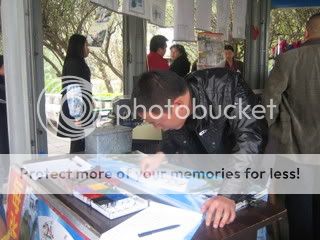 这个作画的男人,不止手艺好,口才也很了得。他以客人的名字作画,一边画一边送上祝福,看着他喃喃自语地画着画着,不禁令人赞叹!画完一整张,还有专人帮你拍照,照片加上名字画,不过才五元人民币,绝对是超值的消费。 |