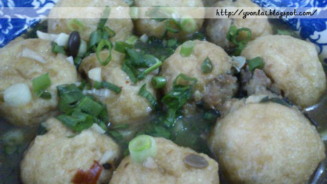材料:豆腐博、猪肉碎(馅料)、葱花、蒜米