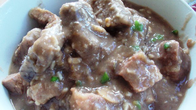 4)盛起备用,爆香蒜米,注入水、糖、盐、胡椒粉、酱油。