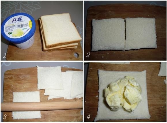 材料:吐司片、冰淇淋、食用油 制作过程: 1、准备几片柔软的吐司片 2、吐司片先切去四边 3、用擀面杖将每片吐司擀成薄片 4、拿一片薄片土司铺底下,挖块冰淇淋在上面