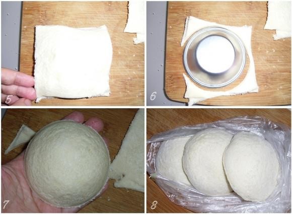 5、再盖上一片薄片吐司 6、拿一个杯子或碗或蛋挞模扣在上面,用力一按 7、切出一个半球状的吐司包冰淇淋 8、做好放冰箱冷冻至硬(四小时以上)