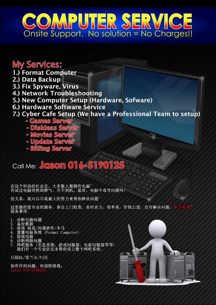 4. 重灌电脑系统 (Format Computer) 5. 组装电脑 6. 诊断网路问题 7. 网吧服务 (无盘系统,游戏伺服器,电影伺服器等等)。我们有一个专业队伍来帮你设立整个网吧系统。