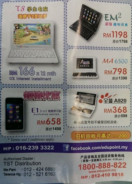 重点过后就看到很多商家到学校推销 书本,玩具,电脑辞典。其中一家卖电脑辞典的档口,他们说现在给“学生特价优惠”。 EM2 电脑辞典 价钱 RM1398。如果现在下单,到时后 EM3(最新版本)面世,就可以换成最新版的 EM3, 同样价钱。当时觉得到学校做促销的,应该比较便宜,而且不会欺骗。所以就买了台 EM2, 价钱是 RM1398,当时放个 RM200 当压低钱。。