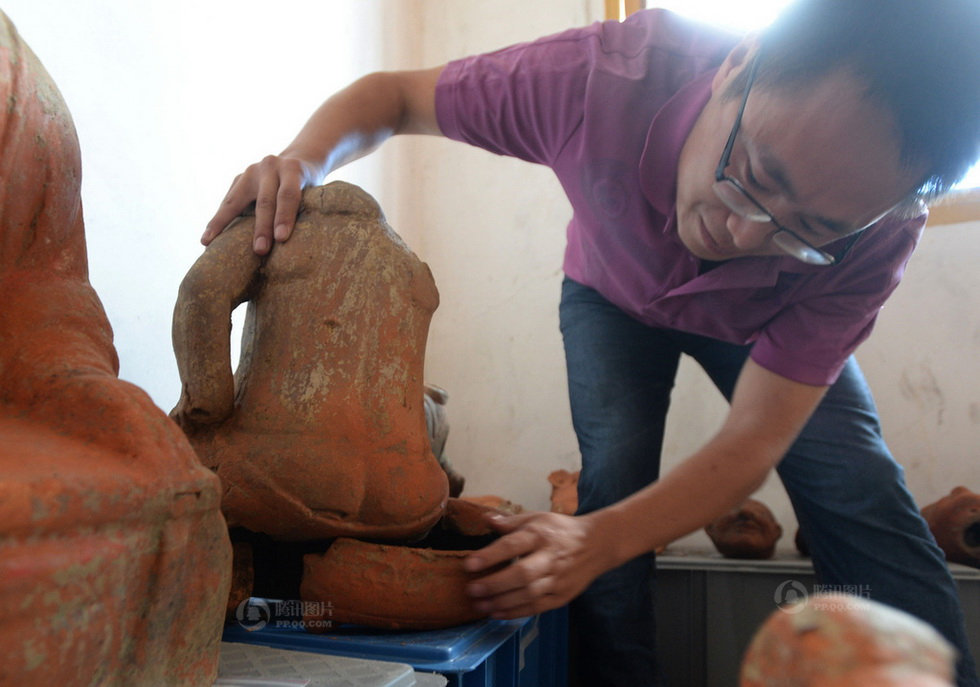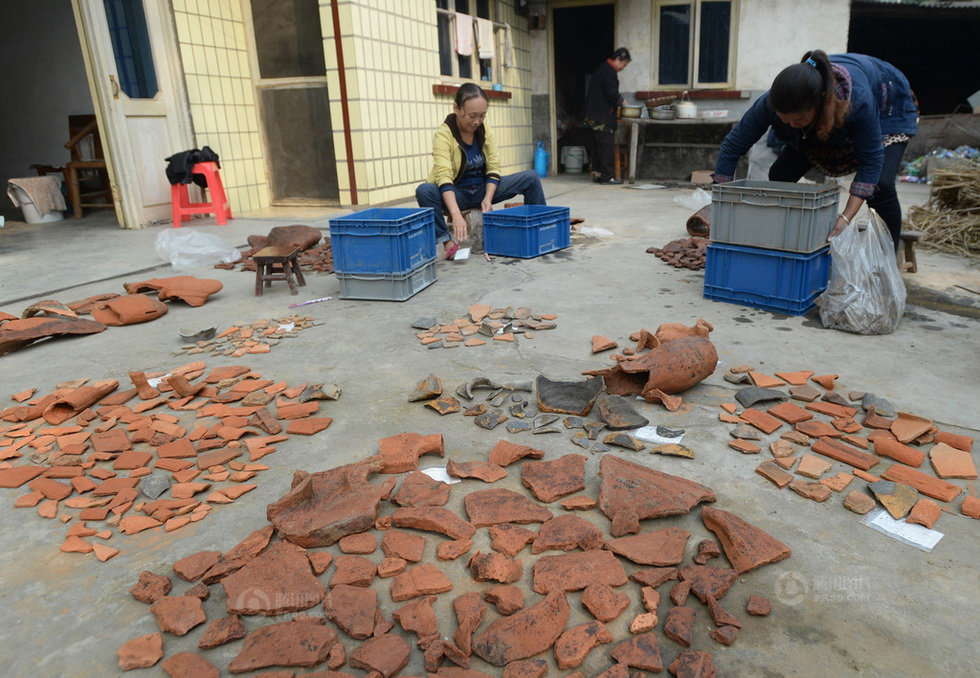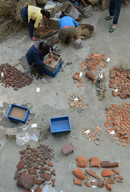 2013年10月9日,四川廣漢,工作人員正在清理漢墓群考古發掘出來的陶器殘片。 專家說,此次發掘,堪稱近年來針對漢墓群的最大規模一次發掘。 2013年10月9日,四川廣漢,工作人員正在清理漢墓群考古發掘出來的陶器殘片。 今日的川渝一帶,古時曾存在蜀郡、巴郡和廣漢郡三大郡。近日,在歷史上蜀郡與廣漢郡的樞紐地帶,廣漢三水鎮,一座由38座漢墓構成的漢墓群被發掘出來,眾多文物遺跡重見天日,為我們還原出近2000年前的歷史片段。