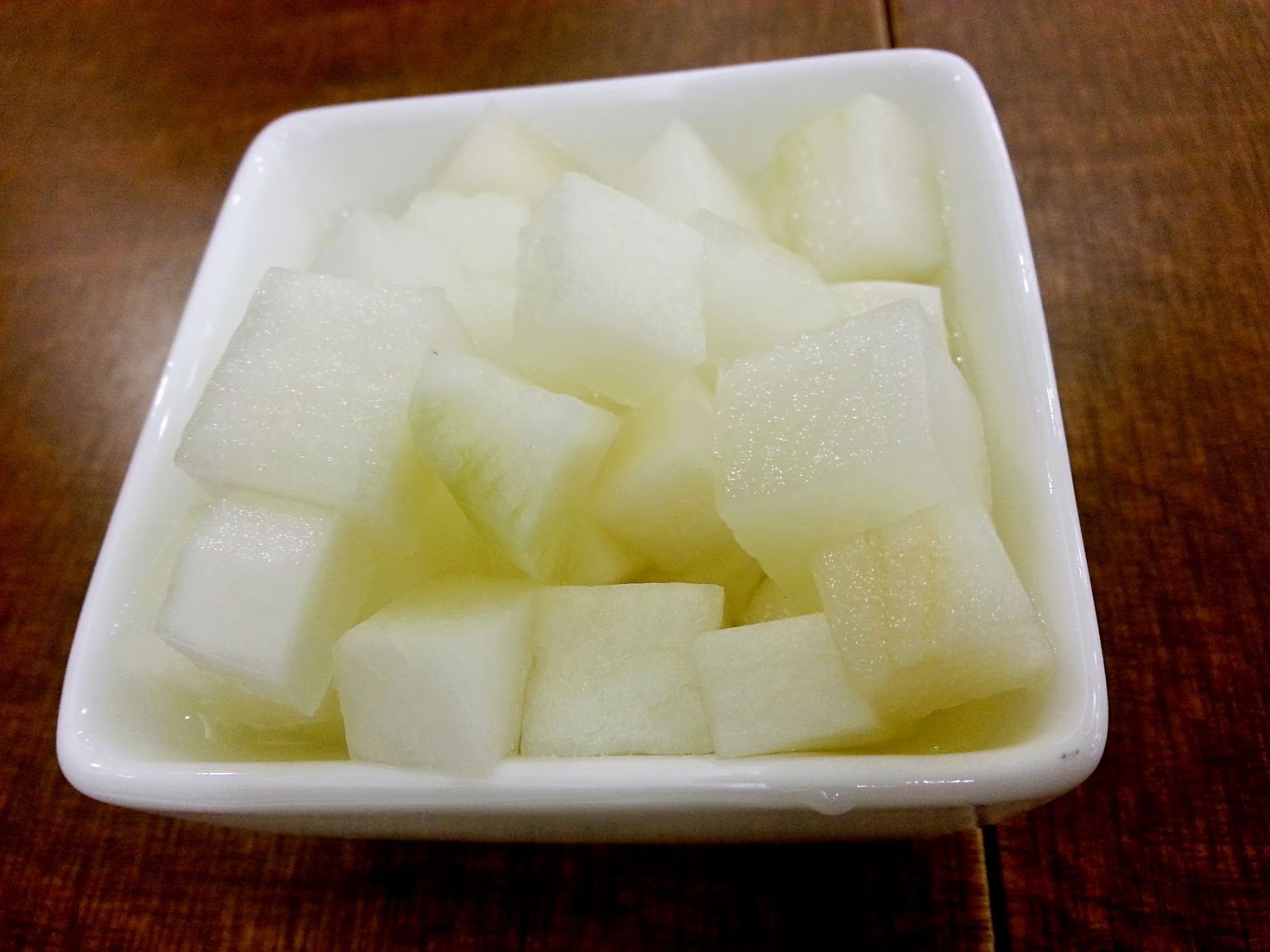 腌萝卜端上时看起来就是白萝卜被切成小丁浸在透明的腌醬里,一口咬下时说实话我有被惊艳到,萝卜爽脆,酱汁酸甜适中,好吃!!