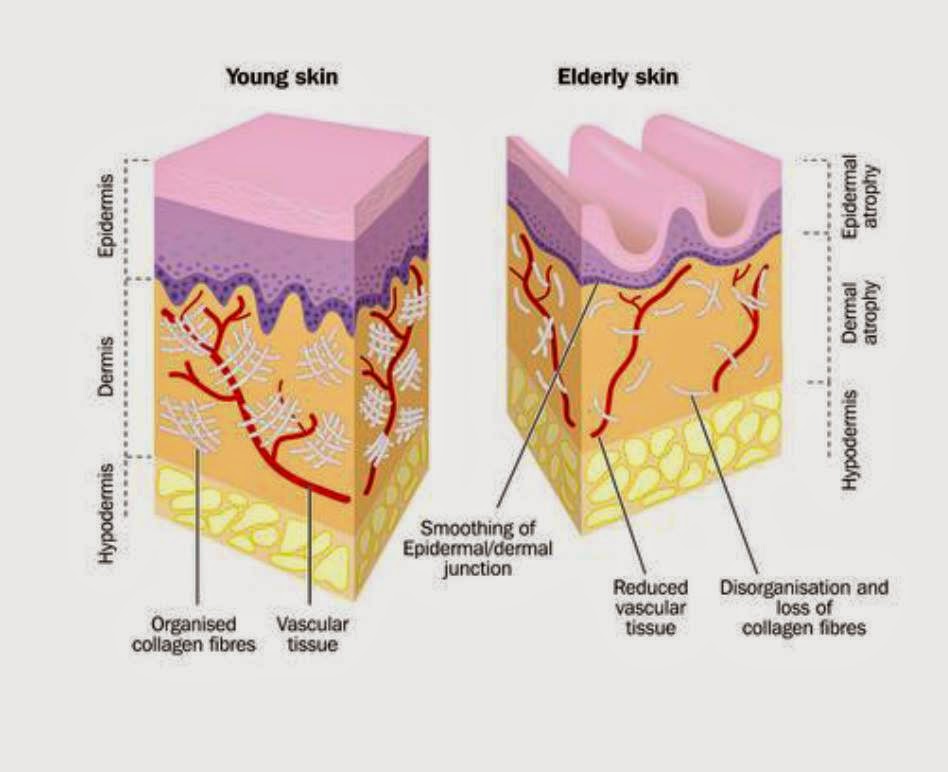 Our skin is at the mercy of many forces as we age: sun, harsh weather, and bad habits. Skin ages also depend on a variety of factors: lifestyle, diet, heredity, and other personal habits. You might notice wrinkles, age spots and dryness as you age. After the age of 20, a person produces about 1 percent less collagen in the skin each year. As a result, the skin becomes thinner and more fragile with age. Your skin also will lose fat, making it less plump and smooth.