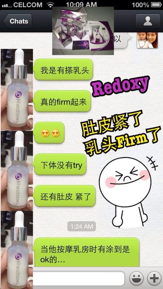MR. TING: 0162208564 如何使用: 1)使用室温水将皮肤清洗干净。 2)然后,使用爽肤水以调色和皮肤的pH值(有或无使用爽肤水均可) 3) 早晚使用Redoxy于色素凝集的部位,并在该部位揉圈圈。 早晚使用Redoxy于皱纹和细纹的部位,并在该部位揉圈圈。 早晚使用Redoxy于毛孔较大的部位,并在该部位揉圈圈。 早晚使用Redoxy于眼袋和黑眼圈的部位,并在该部位轻轻向外拉。 早晚使用Redoxy于颈纹的部位,并在该部位轻轻向上拉。 早晚使用Redoxy于身体所有部位,并在该部位轻轻向上拉。 注意: 1)对中性皮肤,将Redoxy摇均,位于脸部周围,滴4滴后,再轻轻的往上面拉,直到Redoxy完全被吸收。 2)对于干性皮肤,将Redoxy摇均,位于脸部周围,滴5滴后,再轻轻的往上方拉,直到Redoxy完全被吸收为止。 3)对于油性、敏感性和混合性,位于手心,滴4滴后,再涂上脸部周围,轻轻的往上方位,直到Redoxy完全被吸收为止。 4)乳晕私处使用必须温和使用,1/2滴在手然后轻抹于私处即可,乳晕使用方式可以从胸部按摩至吸收!