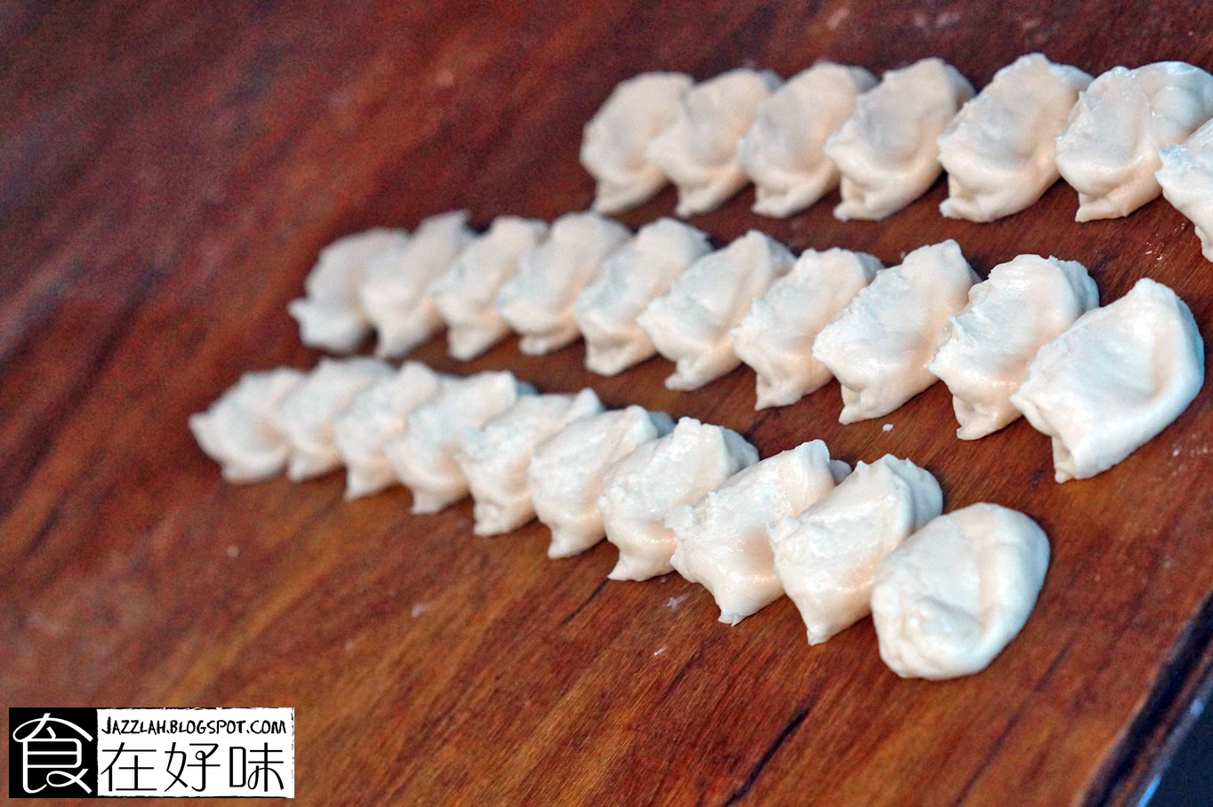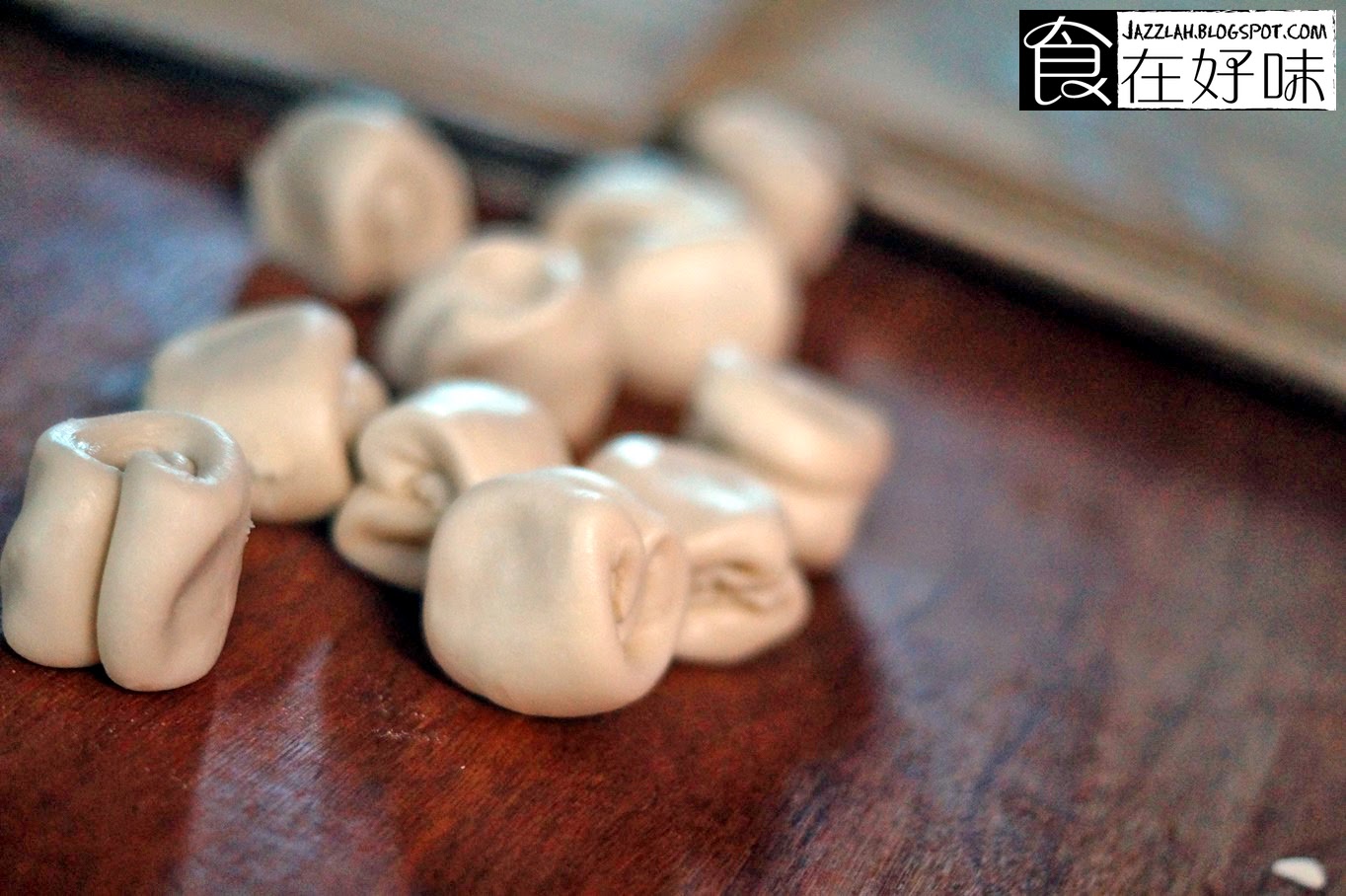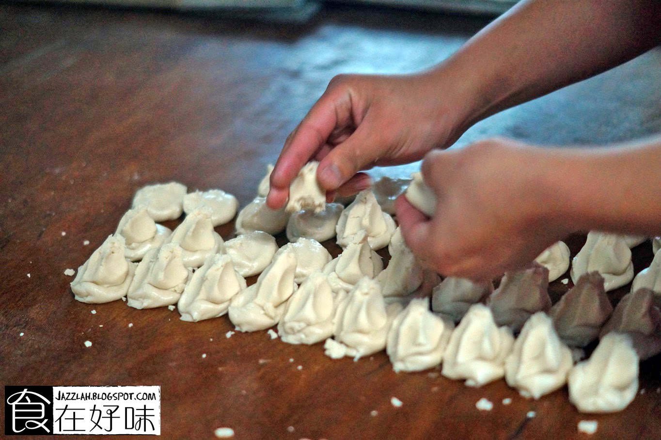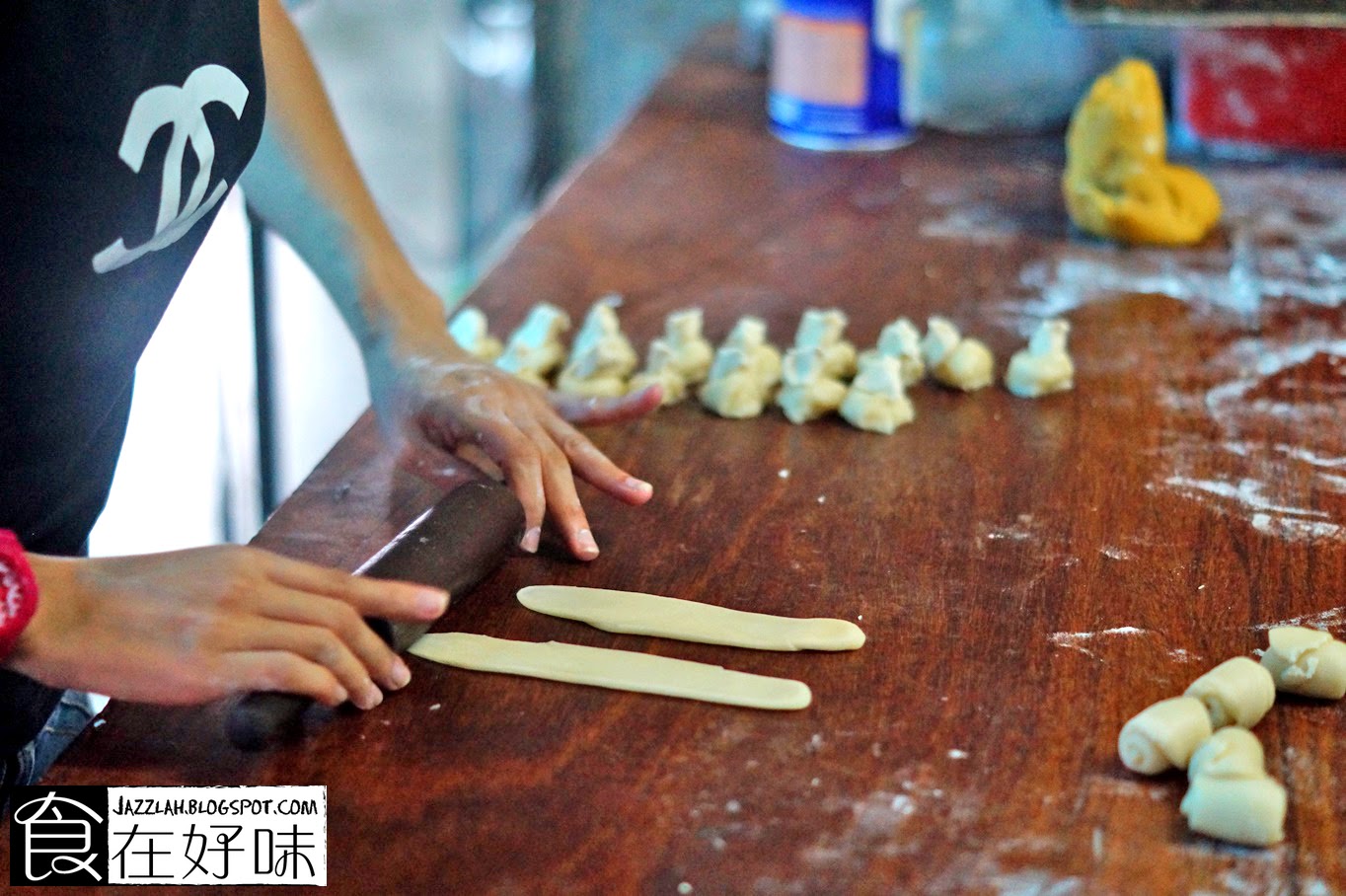 首先也者向我们示范制作香饼的过程,先把搅拌好的皮放入类似搅肉机器把它搅成一条条 而这个程序是需要反复三四次,这样才能把皮搅得松软一些 而这是属于香饼的饼皮的一部分,当中加入了水、面粉和….猪油! 只有加入猪油的饼皮才有一种独特香气!这是很多逐渐迈向Halal的知名品牌所办不到的 之后把皮搓成一粒粒,排成一排排