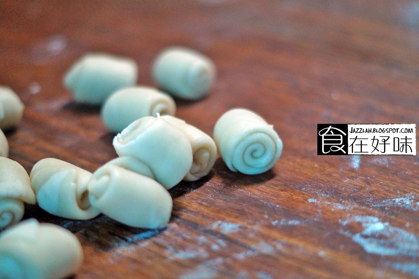 接下来就是制作酥皮,也就是让香饼拥有薄薄一层层的酥脆外层 同样把搅拌好的面糊放入机器内再搅成一条条,程序也是反复几次 之后就把酥皮捏成一小团一小团的然后放在之前制皮的上面 个人觉得最难得的是每粒饼皮并没秤而是单凭业者的“熟能生巧”经验而拿捏,也者信心满满说每颗差异不会超过1克