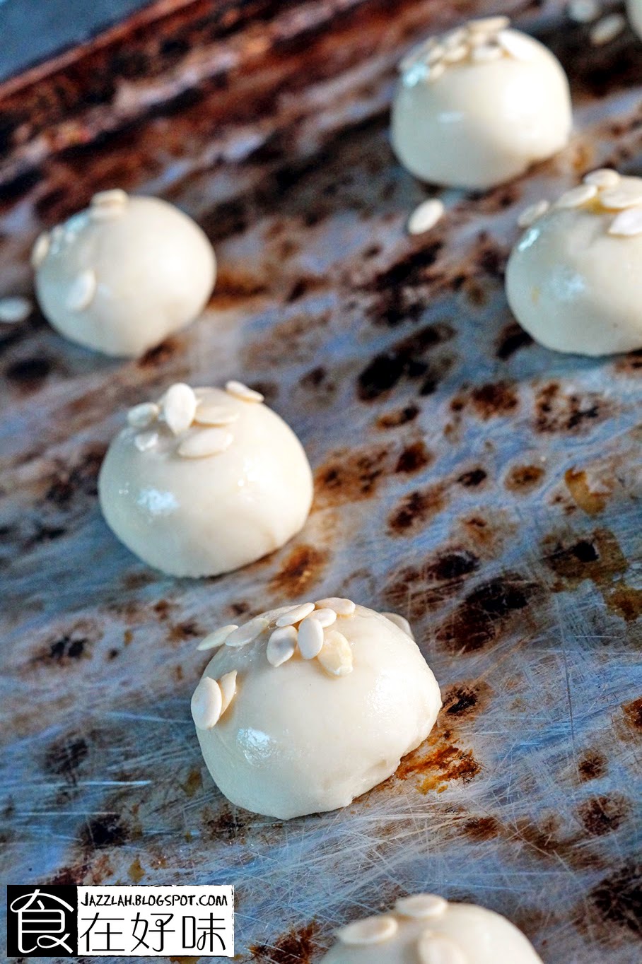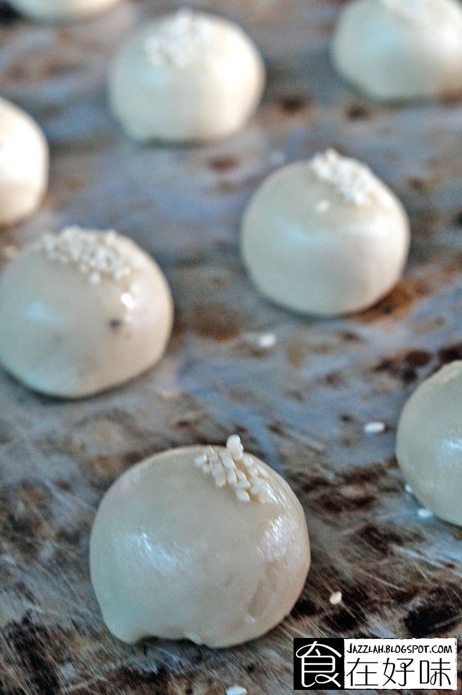之后就在豆沙饼上沾上芝麻而豆蓉饼则沾上瓜子 再之后放入烤炉烘即成为熟悉的豆沙饼