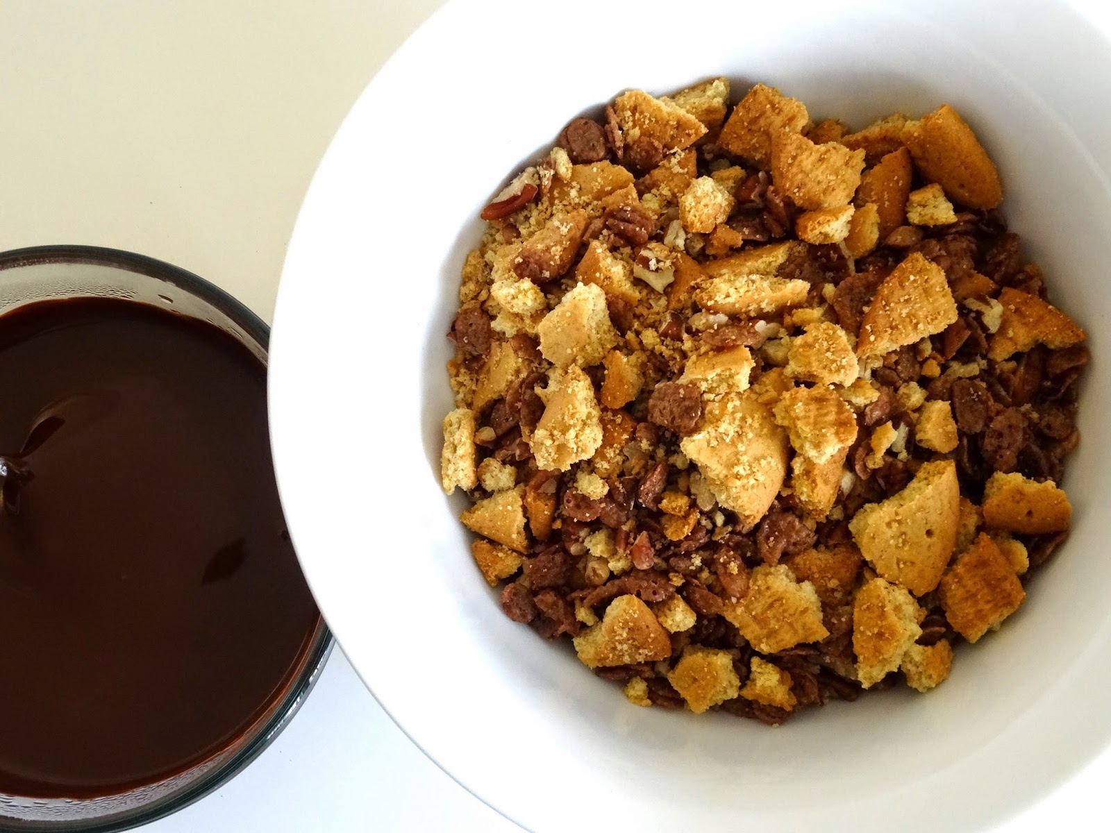 4. 把(3)倒到一個大碗中,加入溶掉的巧克力混合。先別丟棄保鮮袋。